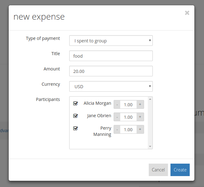 После создания События, необходимо создать платежи (рис. 2), где указывается кто, за что, сколько платил. Если не указывать участников платежа, сумма разделится на всех поровну. Если указать конкретных людей, то, соответственно, сумма разделится только между ними.
