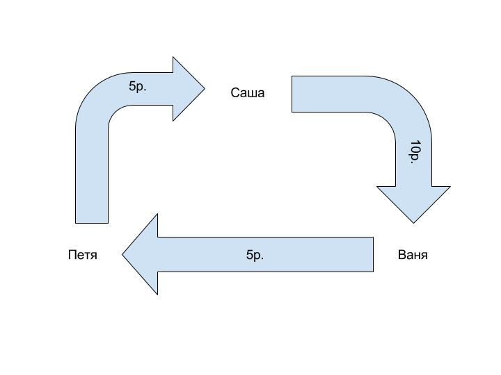 Например, Саша должен Ване 10р., Ваня должен Пете 5р., а Петя должен Саше 5р. В данной ситуации, долги можно уменьшить на 5р. и таким образом облегчить возврат долгов для участников (рис. 5).